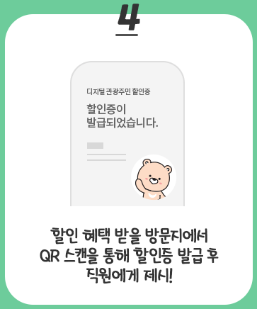 입장 당일 현장에 비치된 "디지털관광주민증" QR코드 스캔 👉 할인증 생성 👉 할인증 제시 👉 직원확인 👉 할인금액으로 결제